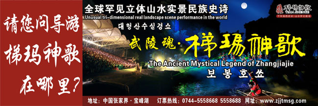 The Ancient Mystical Legend of Zhangjiajie 《武陵魂•梯瑪神歌》是一場記述土家族起源、演變、戰(zhàn)爭、生產(chǎn)生活等內(nèi)容的大型立體山水實景演出,揉合了音樂、舞蹈、文學等多種藝術(shù)形式,如幻如夢的舞美燈光,搖曳生姿的原生態(tài)歌舞……濃縮了土家族數(shù)千年的發(fā)展歷史,400多名演員以自然淳樸的表演充分的展示了土家的民族文化特征,給游客帶來了耳目一新的感受。一場視聽的饕餮盛宴,一曲驚天地、泣鬼神的曠世古歌,給人山水文化光影視聽的享受!境銎罚簭埣医缣莠斏窀栉幕瘋鞑ビ邢薰尽