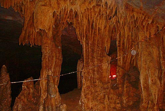 藏君洞為一大型天然溶洞,溶洞長25000米,已探明洞長4000m,洞內洞中有洞、洞中有河,迂回曲折,地下河流水潺潺,溶洞分布在石炭系中、上統(tǒng)碳酸鹽巖中,洞內鐘乳石十分豐富:石筍、石柱、石幔、石樓、石像比比皆是。洞內構造奇特,石鐘乳千姿百態(tài)、絢麗多彩,景觀奇秀,珍品奇絕,是我國少有的大型碳酸鹽巖巖溶洞穴之一。目前已開發(fā)的4000m洞穴中,由十二個大的溶洞群構成,由洞口往里有護君堂、惠帝殿、兩重天、南巡廳、不夜城、龍鳳宮、北國廳、江南廳、江河壩、閱兵場、國寶廳等溶洞景觀區(qū)。溶洞一般高5~30m,長60~100m,寬10~20m,面積60~200㎡。十二個溶洞沿地下河呈串球狀分布,洞與洞之間有巷道(地下河管道)相連,溶洞中景觀十分豐富,仿佛是一個瑰麗的地下宮殿。如護君堂內有“尚書帽”、“御馬”、“貓頭鷹”、“小羊羔”、“老夫妻”、“天宮浴盆”等景點,惠帝殿內由“斷劍石”、“龍椅”、“觀音立佛”、“觀音蓮花寶座”等,“蔬果長廊”中有形似花菜、白菜、絲瓜、茄子、黃瓜等石筍,不夜城內有乳白色石鐘乳巖溶坡面,龍鳳宮內有石幔、石柱琳瑯滿目及鐘乳石構成的似漢白玉“龍鳳石床”、“旭日東升”的浮雕石鐘乳墻、“燈籠群”、“攀龍柱”、“石蓮花”等,國寶廳巨型石柱等,巷道側壁唐僧師徒“西天取經”壁畫等,景觀類型齊全,是巖溶洞穴中具有典型地學意義的巖溶地貌景觀,屬國家級的地質遺跡景觀。