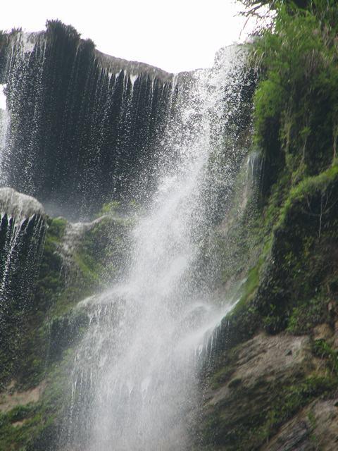 杉刀溝盡頭,有一抹泉水從200多米高的崖頂飄然而下,仿佛一匹白色長(zhǎng)練自天而降。飛瀑下臨深潭,綠水泱泱,水霧漫漫,睛雨交加之日,時(shí)有彩虹飛升。每當(dāng)山洪瀑發(fā),瀑布猶如一巨龍,飛騰傾瀉,聲若巨雷,蔚為壯觀。