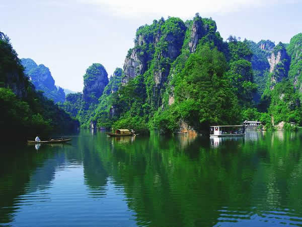 寶峰湖瀑布 湖中有兩座疊翠小島,近岸奇峰屹立,峰回水轉(zhuǎn)。泛舟漫游,只見(jiàn)一湖綠水半湖倒影,充滿詩(shī)情畫(huà)意。“云梯萬(wàn)丈上天臺(tái),高峽平湖一鑒開(kāi),王母瑤池金扶,浣沙仙女下凡來(lái)”游寶峰湖,你就會(huì)欣賞到這樣的詩(shī)情畫(huà)意。群峰擁抱的寶峰湖,長(zhǎng)約2.,5公里,湖猶如一面寶鏡,四面青山,一泓碧水,蕩槳溫游,格外愜意。坐在船上,環(huán)顧四周,千山聳翠,俯視水中,倒影慢移,碧水照相館得群峰綠,人面桃花水映紅。真是靜極了,美極了!韓劇《九天洞》拍攝的湖水就是寶峰湖。