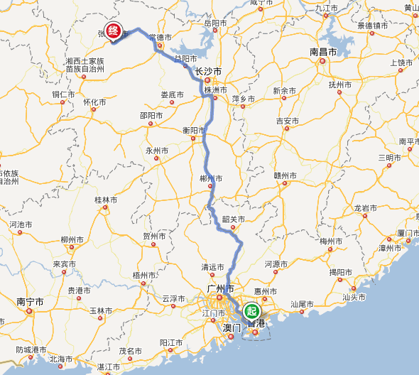 左右,沿途經過深圳——廣州——韶關——郴州——衡陽——湘潭——長沙——益陽——常德——慈利——張家界。