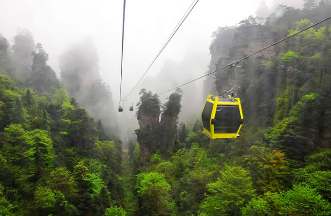 楊家界風光 楊家界索道是世界自然遺產武陵源風景名勝區(qū)繼天子山索道、黃石寨索道后的第三條客運索道,上站位于八里坡游覽線劉家檐,下站位于中湖鄉(xiāng)野溪鋪村。該索道采用法國,斔鞯涝O備,是世界頂級雙回路循環(huán)式配置八人車廂式索道,全長1876米,上下站垂直高差517米,線路支架14個,最高運行速度6m/s,最大運力為2300人/小時,單程運行時間5.2分鐘,是目前國際最先進的客運索道。