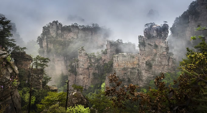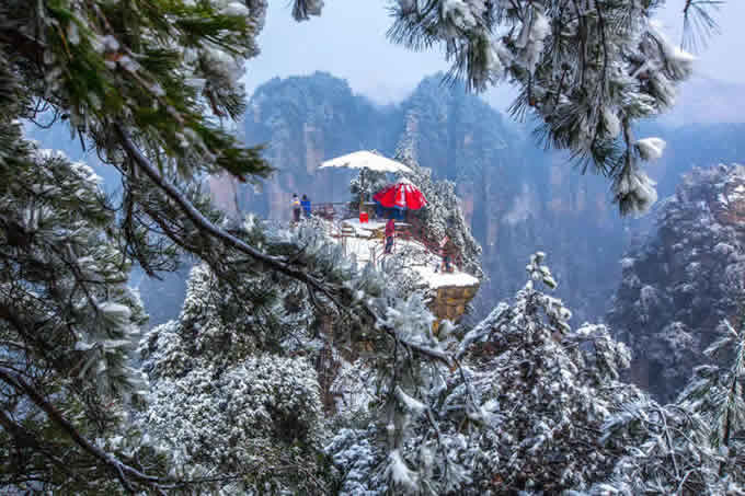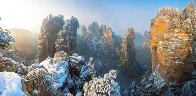 楊家界雪景 作為世界自然遺產武陵源四大核心景區(qū)之一的楊家界景區(qū),地勢險要,風景絕美,跟張家界、天子山、索溪峪比較,其中的地質地貌一部分相同外,又有其獨特的資源優(yōu)勢,擁有全球罕見的峰墻群奇光。乘坐在舒適的楊家界索道里,可以盡情體驗“會當凌絕頂,一覽眾山小”的居高臨下與動感,360度暢游夢想般的楊家界仙界,俯瞰“近在咫尺”的千山萬壑,山舞銀蛇,千嬌百媚的絕美“峰墻”盡收眼底,無限風光在險峰,數(shù)十道氣勢如虹的石墻,一排排層巒疊嶂,相對平行而立,高矮參差不齊,宛如“天然長城”,真是美輪美奐,絕景天賜,不得不讓人驚嘆大自然的璧山開地之功。
