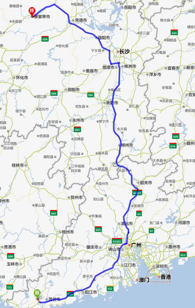 化州去張家界自駕車自助游線路圖全程高速):